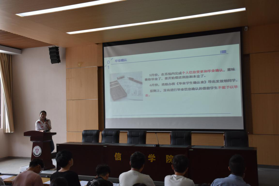 辅导员刘萌老师向毕业生详细介绍了国家开发银行、中国银行生源地助学贷款的还款政策和注意事项,并用学生的实际案例向毕业生讲解了按时还款的重要性,提醒毕业生要诚信还款,否则将影响个人征信、职业发展和个人生活。另外,刘萌老师还介绍了团组织关系转接办理的要求和程序。