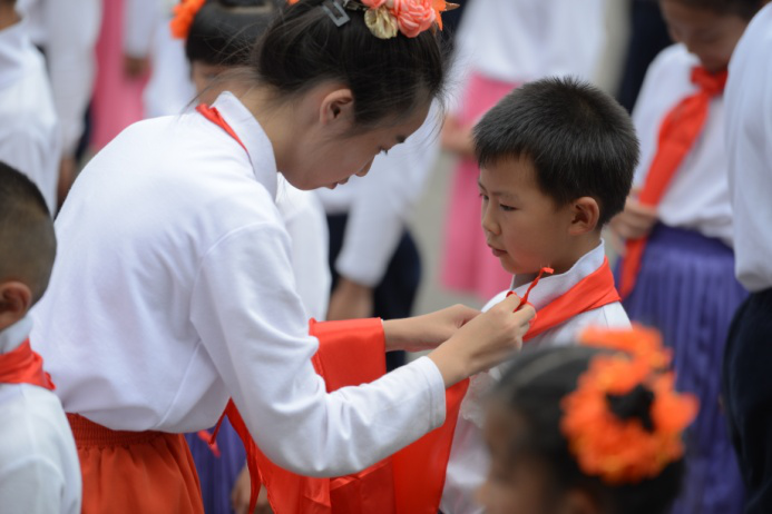 中队旗手从大队委手中接过了鲜艳的队旗,正式加入了少先队组织的大家庭。最后,大队部老师带领全体新队员呼号,希望大家勤奋努力,不断进取,用实际行动为胸前的红领巾增添光彩。