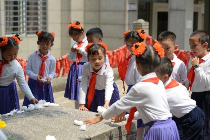 在明媚的阳光下,一年级的队员们排着整齐的队伍体验着这难忘的仪式。在“一二·一”运动四烈士墓前,新队员们聆听了烈士的感人事迹,他们怀着激动的心情,佩戴上了期盼已久的红领巾,齐唱《中国少年先锋队队歌》,并在烈士墓前庄严宣誓:“我是中国少年先锋队队员。我在队旗下宣誓:我热爱中国共产党,热爱祖国,热爱人民,好好学习,好好锻炼,准备着:为共产主义事业贡献力量!”铮铮誓言响彻烈士墓园。