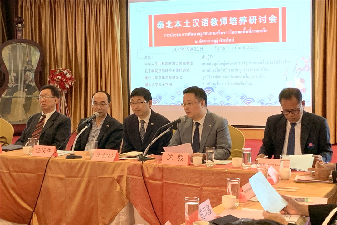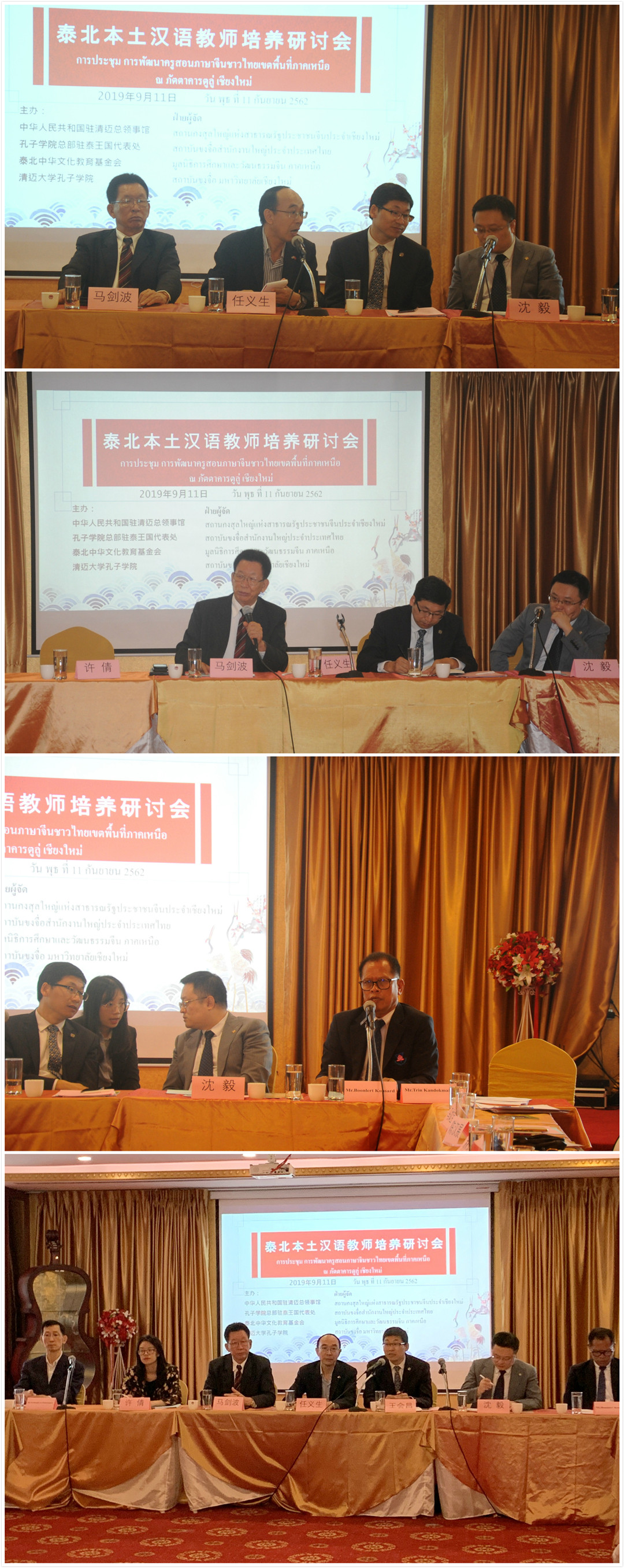 9月11日,泰北本土汉语教师培养研讨会在清迈成功举行。本次研讨会由中华人民共和国驻清迈总领事馆、孔子学院总部驻泰王国代表处、泰北中华文化教育基金会和清迈大学孔子学院联合主办。中华人民共和国驻清迈总领事馆任义生总领事、孔子学院总部驻泰王国代表处王会昌处长、泰北中华文化教育基金会马剑波主席、清迈大学孔子学院中泰方院长、泰国教育部基教委新任办公室主任伯乐先生(Mr. Boonlert Konsard)、泰国教育部基教委高级项目官员狄恩先生(Mr.Trin Kandokmai)、泰国教育部民教委特别政策处处长克林改·希拉伦斯利先生(Mr.Kriengkrai Silarungsri)及汉语项目顾问黄淑环女士(Mrs.Sukanit Piyavittayanon)、清迈教育局代表、泰北华文民校联谊会代表、清迈大学代表、泰北地区汉语示范中心学校代表及媒体代表共50余人出席了研讨会。研讨会由清迈孔院中方院长沈毅主持。
