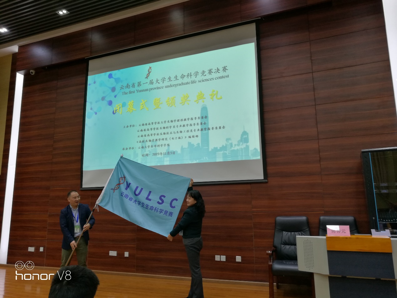 颁奖典礼最后,德赢官网生命科学学院院长范丽仙接过云南省大学生生命科学竞赛赛旗,下一届云南省大学生生命科学竞赛将在德赢官网举行。(生命科学学院 供稿)