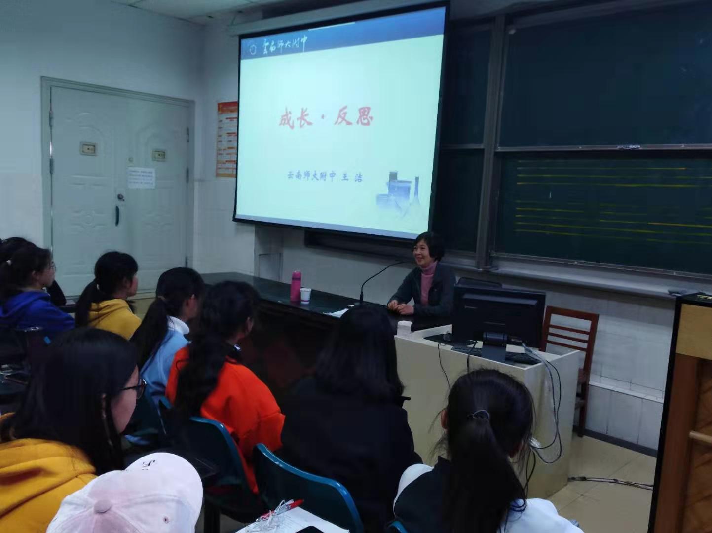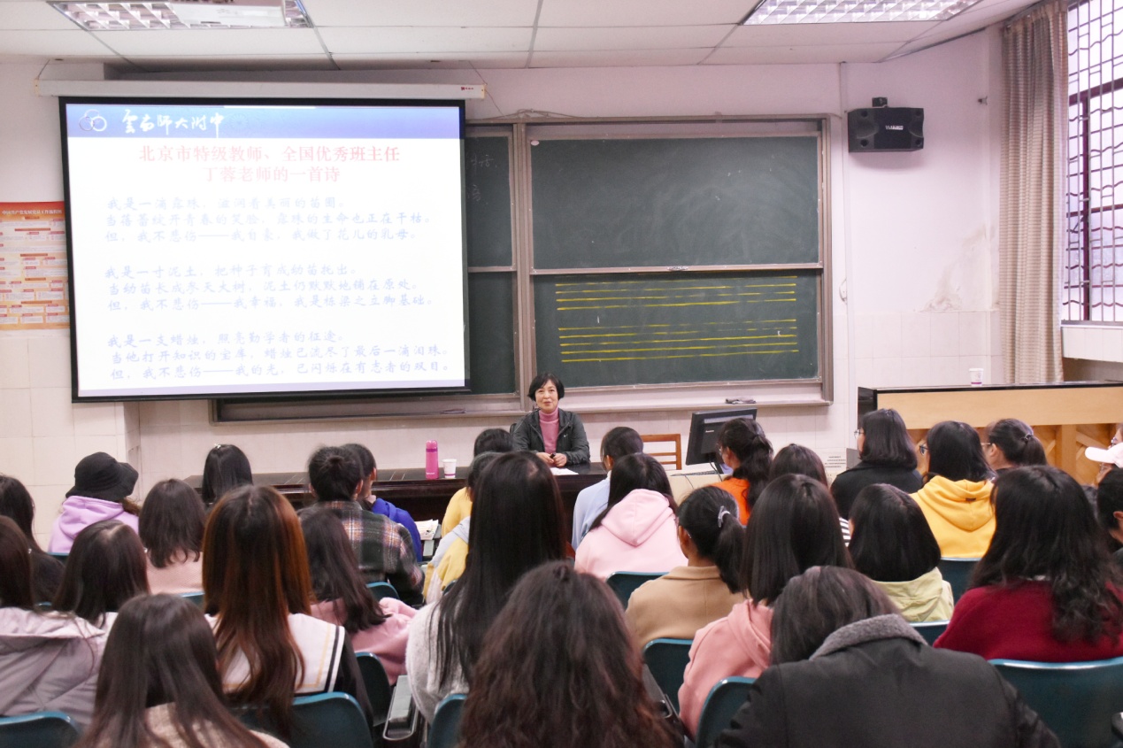 王洁老师以“成长与反思”为主题,从北京市特级教师、全国优秀班主任丁蓉老师的一首诗为开篇,诠释作为一名教师既要照亮别人,又要不断地进行自我充电,在赋能的过程中对教师行业和育人工程做出贡献。接着,从“择业”、“创业”、“乐业”、“敬业”、“爱业”的角度层层推进,结合从教34年中的典型案例,向在场同学们展示了做老师、做班主任“快乐、幸福”五步曲。最后,通过分享“STEM”教育理念,分析未来教师的七个趋势,告诫在场同学们要做一名称职的教育工作者,创新非常重要,大家要在不断的磨砺与学习中创新理念和方法,掌握先进的教育技术和手段,把自己的业务水平练到足够强大,才能充满自信、一路前行。