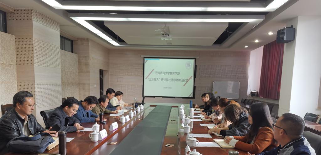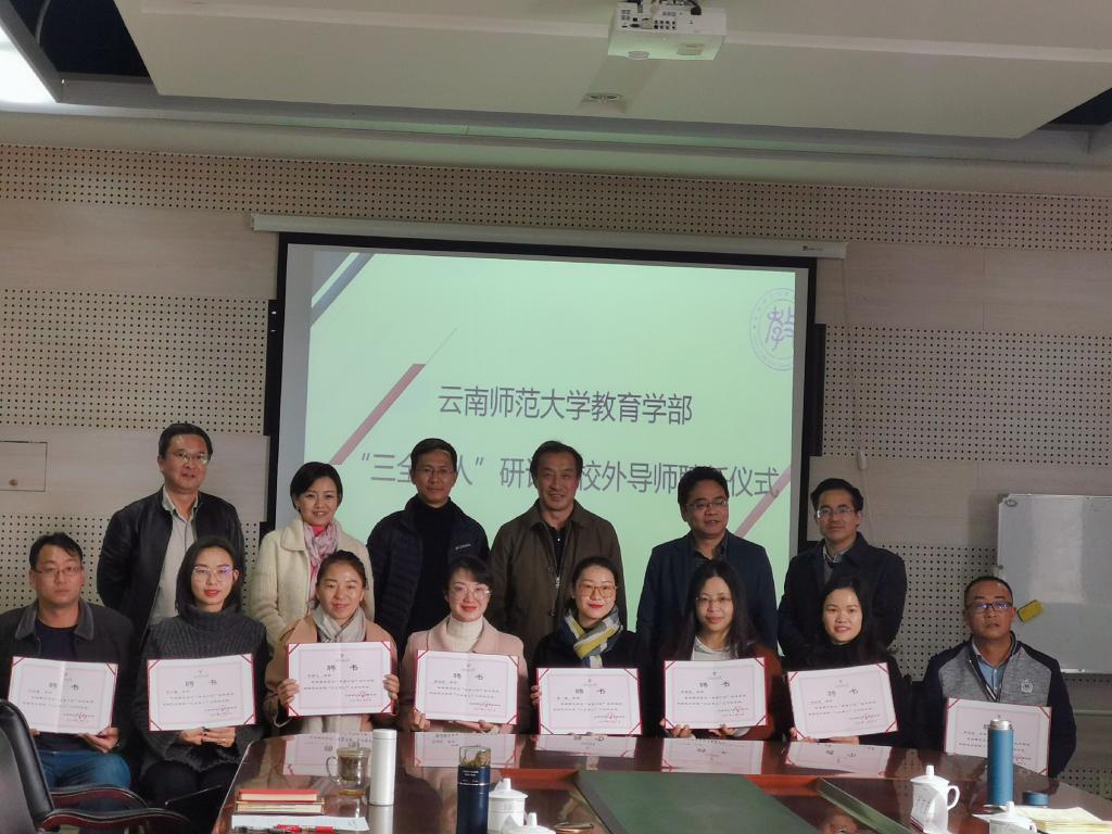 为深入学习贯彻党的十九届四中全会精神,深入推进“不忘初心、牢记使命”主题教育,深入开展“三全育人”综合改革工作。教育学部于2020年1月6日在明德四号楼322会议室举行“三全育人”工作研讨暨校外导师聘任仪式。云南省“万名校长培训计划”项目办公室副主任杨超,学部党委书记张云、主任李长吉、副主任刘六生以及云南省“万名校长培训计划”项目第三期学员代表、学院辅导员、班主任、教师代表参加了聘任仪式。会议由学部党委副书记刘虹主持。