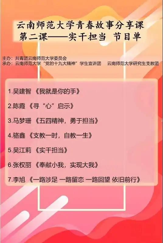 6月4日晚,校团委开展了第二期“奋斗的我,最美的国”社会实践活动,活动以实干担当为主题,邀请全国第七届道德模范,昭通学院学生吴建智,德赢官网第五届研究生支教团团长骆鑫、第六届研究生支教团成员李旭、华文学院陈霞、教育学部马梦珊、文学院吴江莉和哲政学院张权丽7位同学担任分享嘉宾。以自己的切身经历和身边的真人真事为切入点,讲述青春故事,引领同学们深刻理解实干担当的意义,在担当中历练,在尽责中成长。
