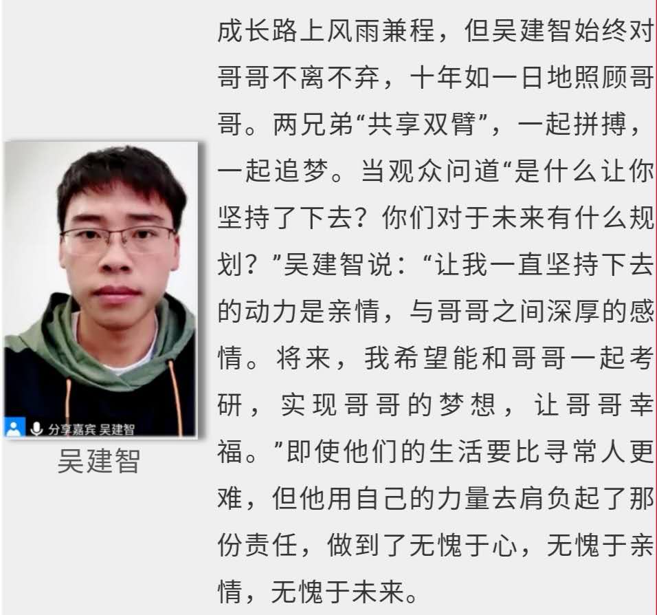 吴建智同学在线讲述了与失去双臂的哥哥之间的故事,“一辈子的路还有很长,我愿意一直做他的双臂,帮助他完成梦想。”吴建智的话令老师同学们感动,他面对生活的磨砺始终坚强不屈的意志品格也让大家由衷钦佩。