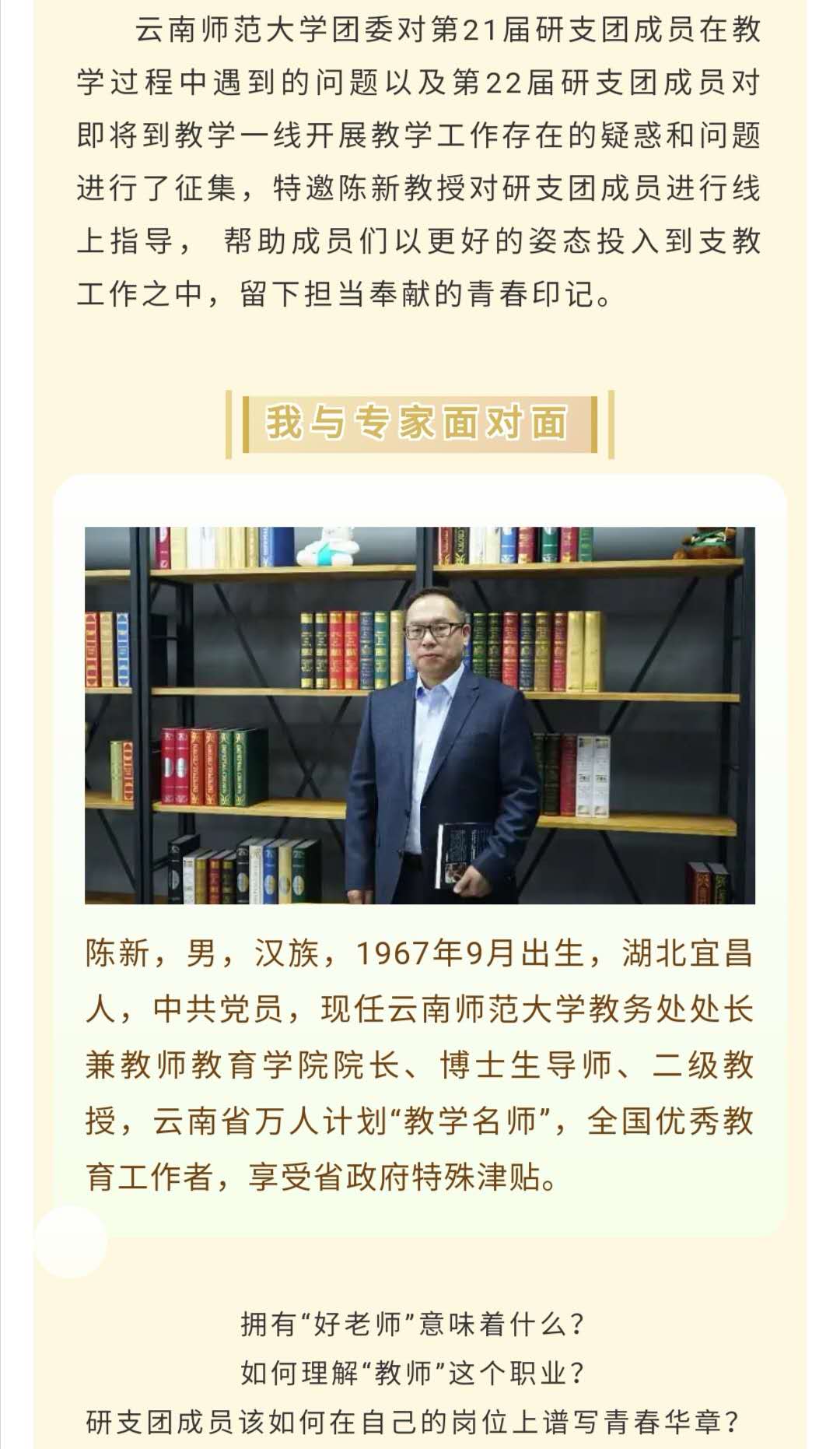 首期活动邀请到了全国优秀教育工作者,德赢官网教务处处长兼教师教育学院院长,陈新教授作为分享嘉宾,为德赢官网研究生支教团成员在支教过程中存在的疑惑和遇到的问题进行线上指导,帮助成员们以更好的姿态投入到支教工作之中,留下担当奉献的青春印记。
