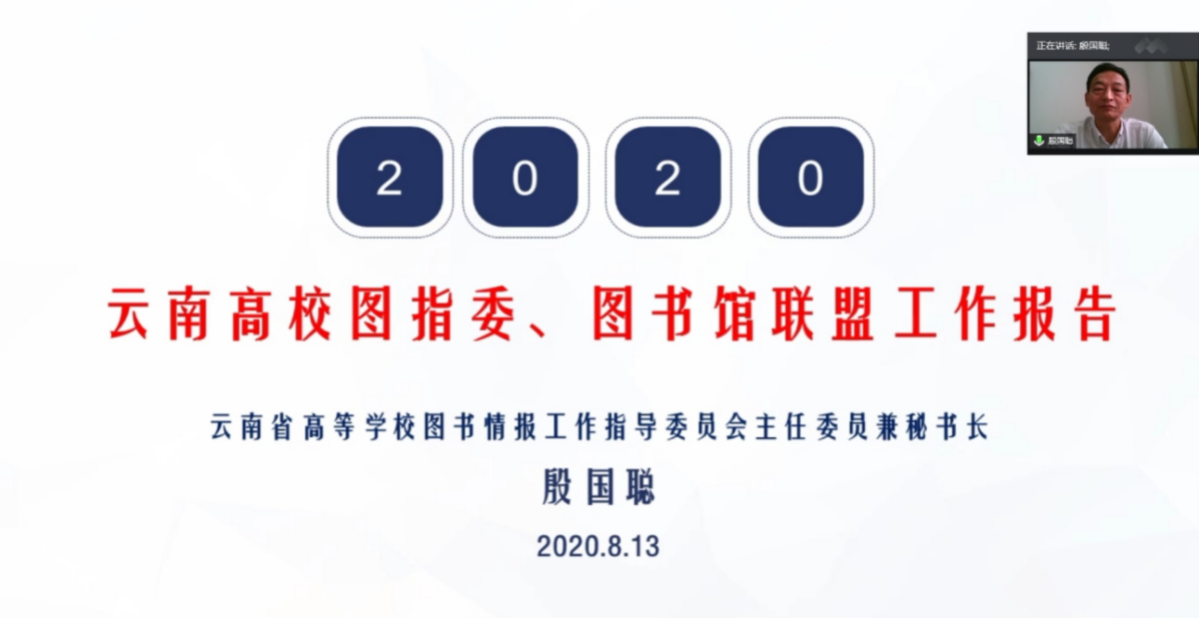 云南高校图指委主任委员兼秘书长、德赢官网Vwin图书馆殷国聪馆长作了《云南高校图指委、图书馆联盟工作报告》,总结了2019年、2020年上半年图指委和图书馆联盟的工作,并指出2020年下半年重点工作。