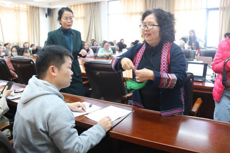 讲座中,吴松懿女士还精心设置了实践操作环节,在她带领下,云南省民族博物馆6名馆员逐一指导同学亲手制作艾草香包。在此过程中,同学们热情投入,细致认真。