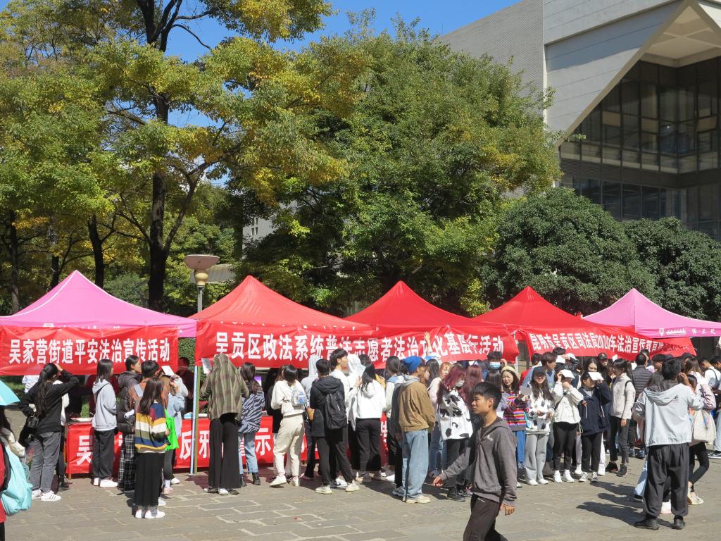 为提高全校师生整体法治意识和安全意识,引导广大师生员工自觉遵法学法守法用法,共同营造安全有序、和谐稳定的校园法治环境,11月6日上午,学校保卫处联合呈贡区委政法委、区法院、区检察院、市公安局呈贡分局、区司法局、团区委、吴家营街道办事处7家单位在呈贡主校区开展法治安全集中宣传活动,呈贡区委政法委副书记王远昆、吴家营街道办事处综治办主任赵果良、保卫处胡兆海处长、汪飞奇副处长全程参加此次活动。
