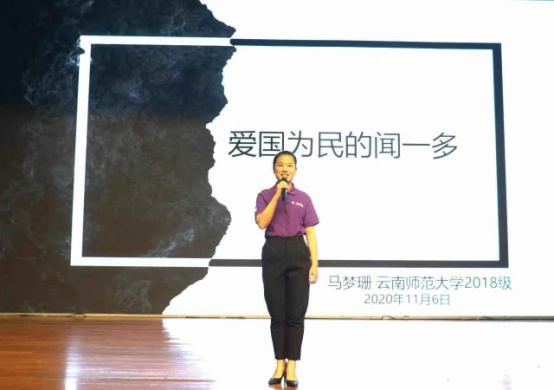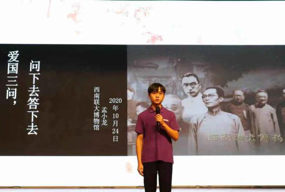 宣讲团5位成员从不同角度讲述西南联大爱国主义主题故事。王馨同学作了《不负韶华,不负时代》的主题宣讲,激励新时代青年们传承和弘扬西南联大爱国主义精神,为实现中华民族伟大复兴贡献力量。马梦珊同学作了《爱国为民的闻一多》宣讲,讲述了闻一多先生为民主运动、民族兴亡献出自己生命的故事。毛肖琼同学分享了联大学子穆旦“救国不忘读书”参加远征军,克服恶劣环境、奔赴前线的故事。张睿贤同学在《逐梦青春》的宣讲中,分享了自己作为一名边防战士在部队接受训练、执行任务的军旅生活,将个人经历与西南联大精神相结合,激励在场的青年学子不忘初心,砥砺前行。最后,孟小龙同学以《“爱国三问’,问下去答下去” 》为题,讲述了南开大学校长张伯苓先生发人深省的“爱国三问”,将宣讲会气氛推向了高潮。