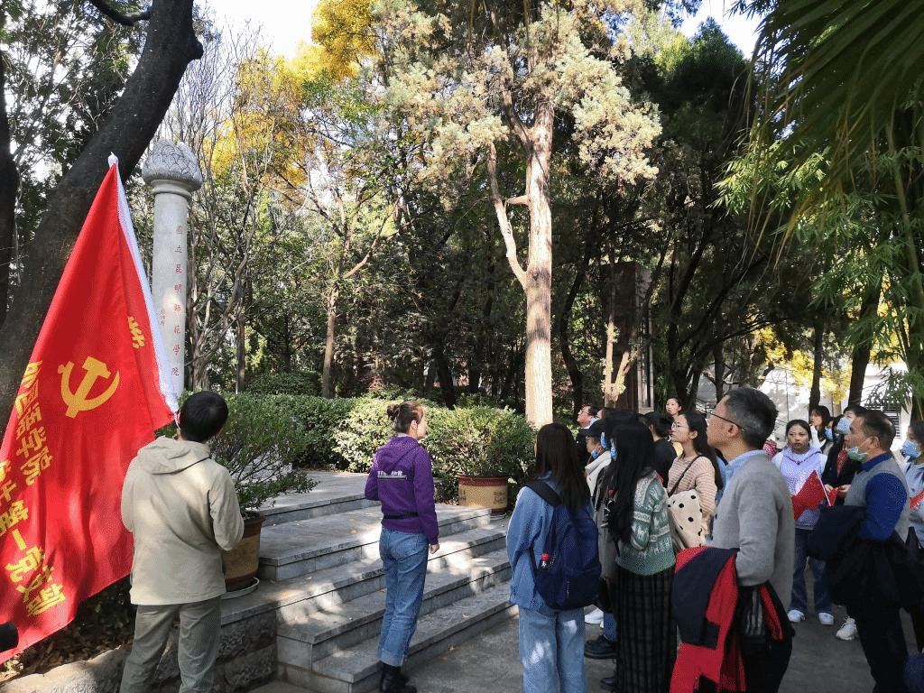 随后,在教工第一党支部孙兴文同志的带领下,全体师生党员来到了一二一校区外国语学院教学楼前,孙老师向大家讲述对外国语学院的深厚感情以及从教几十年来对于这份职业的尊重与热爱,让在场每一位同志都满载感动与收获,同时也向大家阐释了应以怎样的身份和态度去回顾历史,如何用自己的努力将联大精神薪火相传。