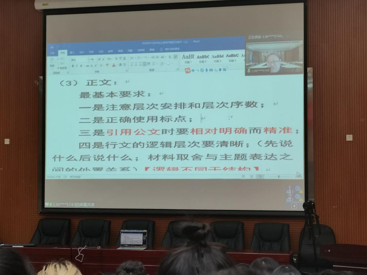 下午13:30,南京师范大学冒志祥教授在明德二号楼报告厅为大家做了《公文写作技巧谈》的专题讲座。冒志祥教授强调,公文写作要具有公务意识、规范意识,并就如何总体建构这两个方面进行详细讲解。冒教授指出,秘书学的核心竞争力是表达能力。秘书学子应在学习积累中多查、多读、多记、多仿多用,从而提升自己的专业能力。