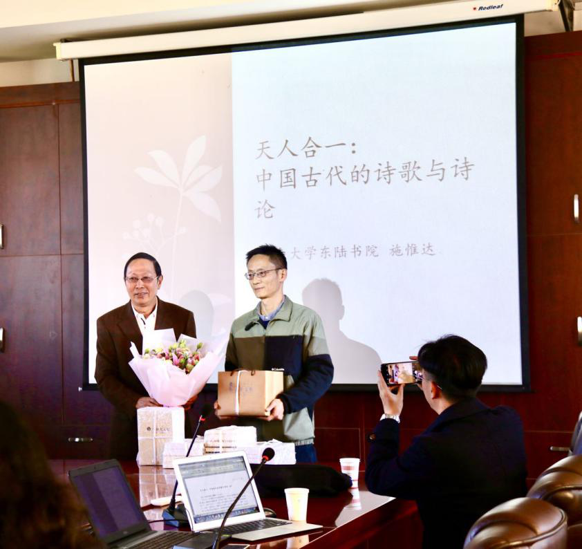 施惟达教授结合自己多年积累的经验及思考,从诗歌之感物起兴:与自然同悲欢、诗歌之情感交融:万物与我为一、诗歌之言近旨远,超越表象的世界、诗歌之温柔敦厚,与天地相俯仰四个方面来分析中国古代诗歌与诗论中的天人合一,并一一进行详细讲解。施惟达教授以全新的视角解读了中国古代诗歌与诗论中的天人合一,在座师生受益匪浅。
