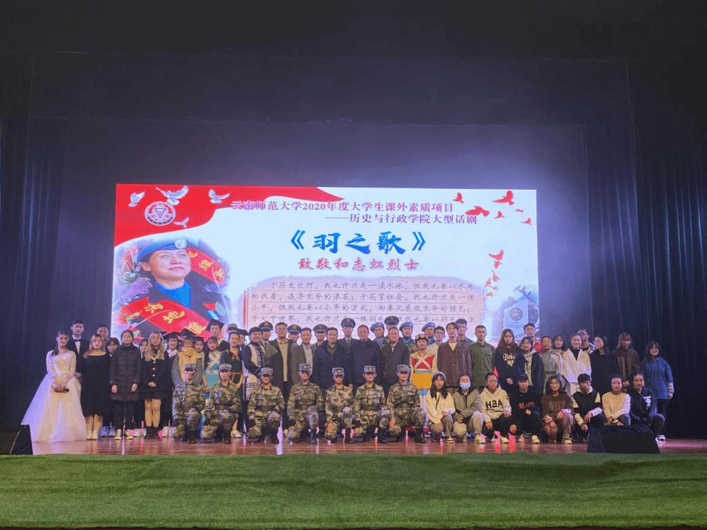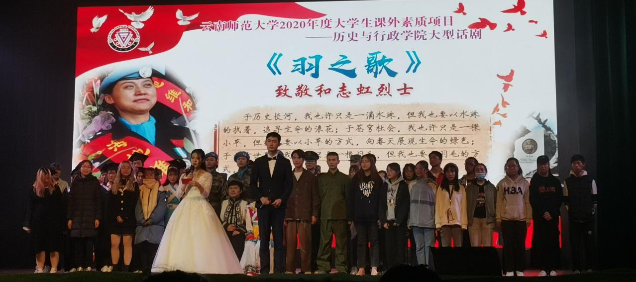 德赢官网Vwin2020年度大学生课外素质项目——历史与行政学院鲲鹏话剧社大型话剧《羽之歌》于12月9日晚在明德5号楼演播厅举行公演。党委宣传部,对外合作交流处,音乐舞蹈学院,传媒学院,云南华文学院,数学学院,历史与行政学院等相关单位负责人出席并观看了演出。