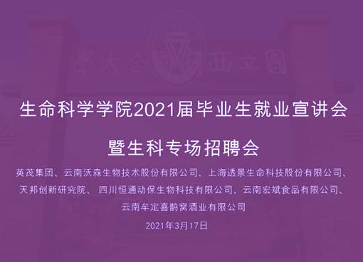 为进一步帮助毕业生明确就业方向,树立正确的就业观和择业观,认清就业形势,把握就业机会,搭建就业桥梁,积极主动就业,生命科学学院于2021年3月17日下午在睿智3-106报告厅举行了2021届毕业生就业宣讲会暨生科专场招聘会,本次会议也是生命科学学院第三次全体毕业生的就业宣讲会。学院党委副书记唐明靖老师主持会议,2021届全体毕业生、辅导员、毕业班班主任、英茂集团等7家生物相关企业参加。