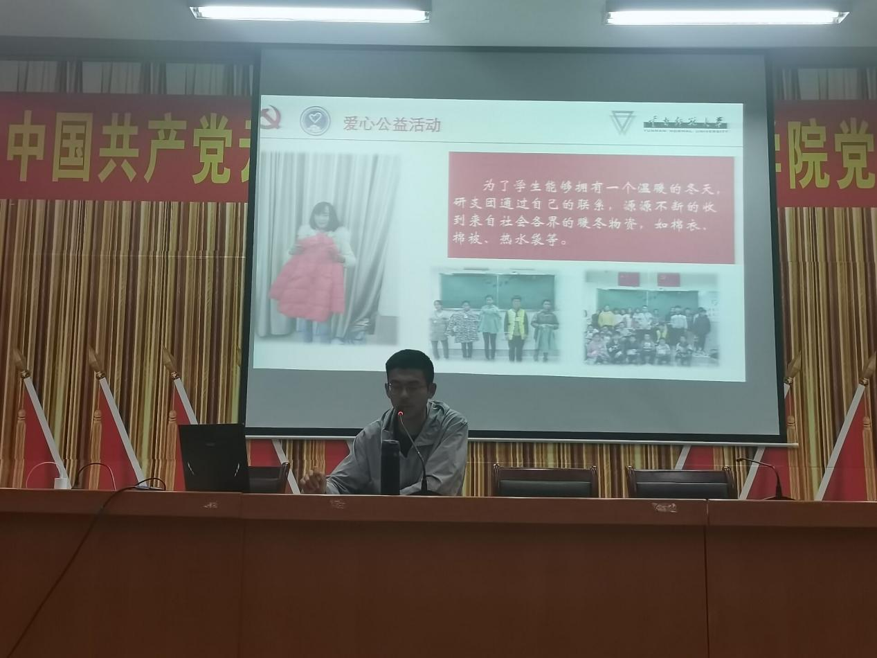 随后,他向同学们介绍了研究生支教团在龙泉中学组织的送教材下乡、组建学生会、举办课间活动和体育节等校园活动。活动开展不仅丰富了龙泉中学学生们的课外活动,还拉近了支教团与乡村孩子们的交流距离。另外,支教团向社会募集善款实现乡村学生的音乐梦想,同时为贫苦孩子们捐赠棉袄、棉被等暖冬物质;还通过开展家访和保学活动等,传播了正能量,让乡村孩子也能拥有更多的生活学习物资,获得更多的学习机会。