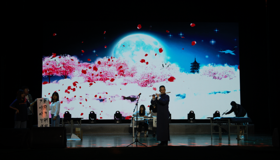 提问环节结束之后,同学们纷纷上台进行现场书法创作。与此同时,音乐舞蹈学院的杨代芝同学和黄顺同学分别表演了古筝独奏《寒鸦戏水》和笛子独奏《姑苏行》,将现场气氛推向了高潮,为大家带来一场书法与音乐的盛宴。