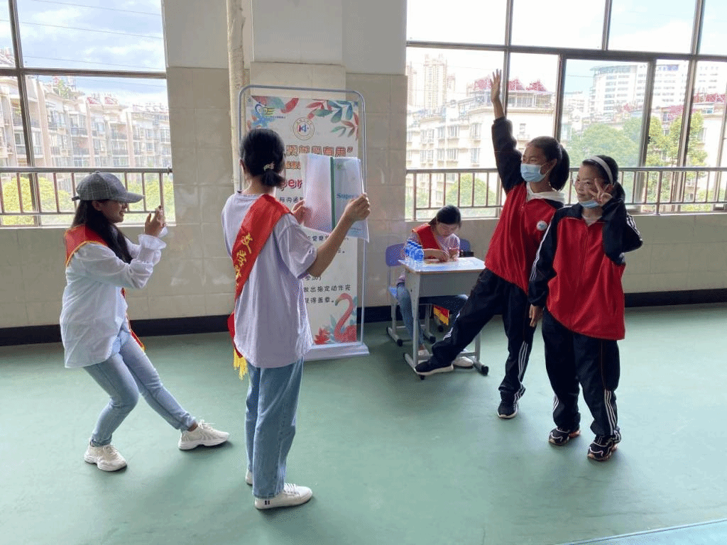 文学院志愿者参加了中小学心理健康日启动仪式以及“天生我才必有用”心理素质拓展活动。此次心理素质拓展活动面向初一学生展开,以“多元智能理论”为基础,设计了心理素质拓展游戏,游戏设置符合该年龄段学生的认知特点,契合学生日常关注度较高的生活热点,内容丰富,教育意义极强,包括“穿越火线”“足球小将”“节奏达人”等14个游戏。通过游戏帮助初一学生发现自己的智能优势,形成对自己的积极评价,优化学生自我认知,提升学生的自信心。