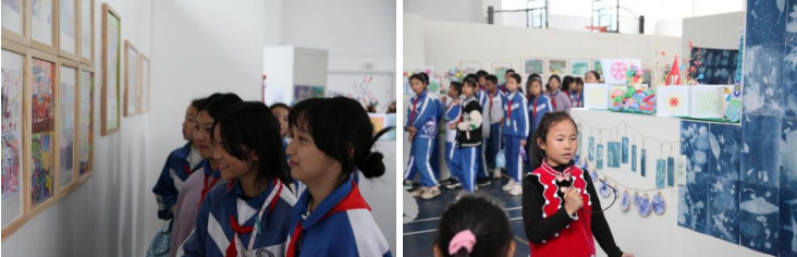 开幕式结束后,艺术节嘉宾和泸水各中小学师生一同参观展览。展览由文化长廊、户外田径场、室内篮球场三个区域组成,展出泸水市、贡山县各中小学生艺术作品共700余件。作品内容涵盖绘画、书法、篆刻、版画、雕塑、扎染、草木染、手工、黏土、涂鸦、纸艺、剪纸、手工书、装置、文创产品等多种内容。
