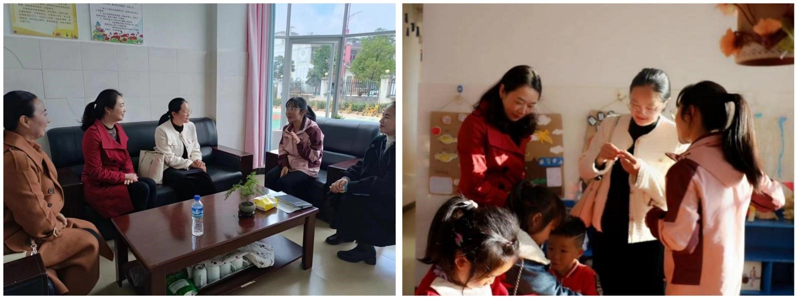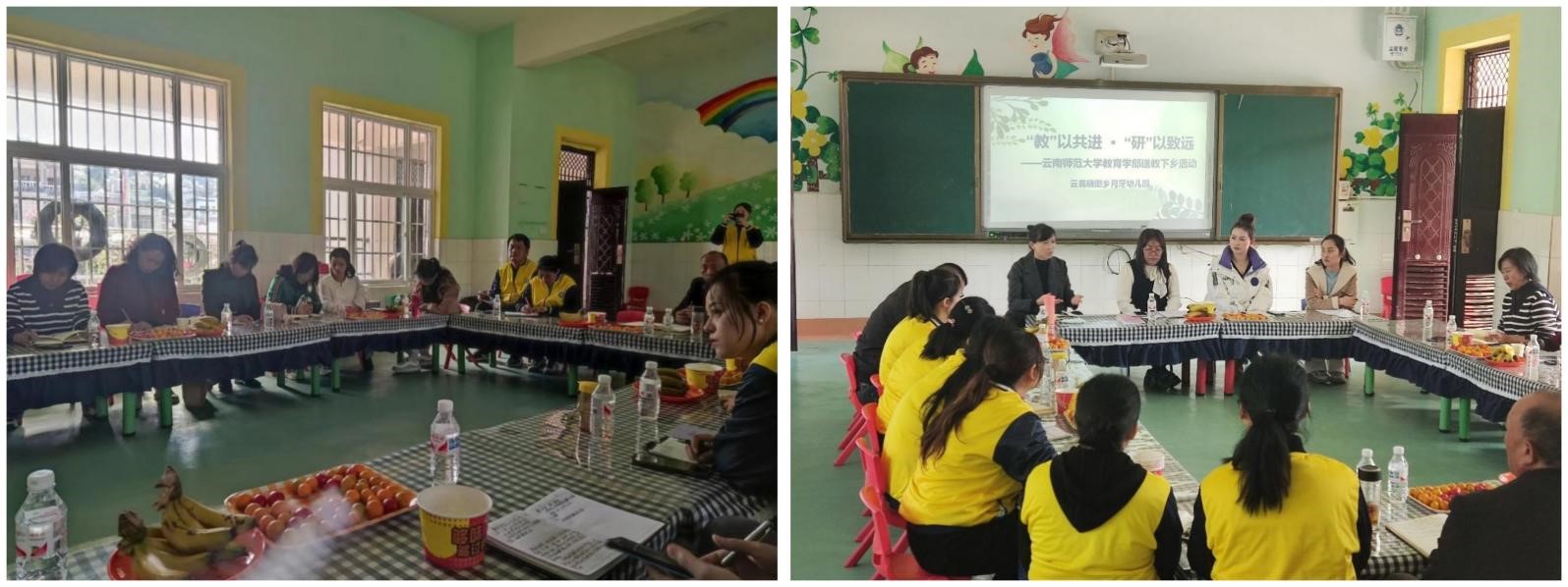 12月14日,由教育学部傅媛蕾老师、学生助理张建,五华区第二幼儿园周黎、颜尔雅老师组成送教小组,前往临沧市云县开展工作。工作小组同云县晓街乡中心学校李先华老师、涌宝中心幼儿园施玉芳老师、月牙幼儿园王金枝老师开展座谈,了解当前云县地区幼儿园的现状及发展情况,并针对晓街乡月牙幼儿园的“环境创设”和“课程教学”进行探讨,与幼儿园部分教师开展座谈。