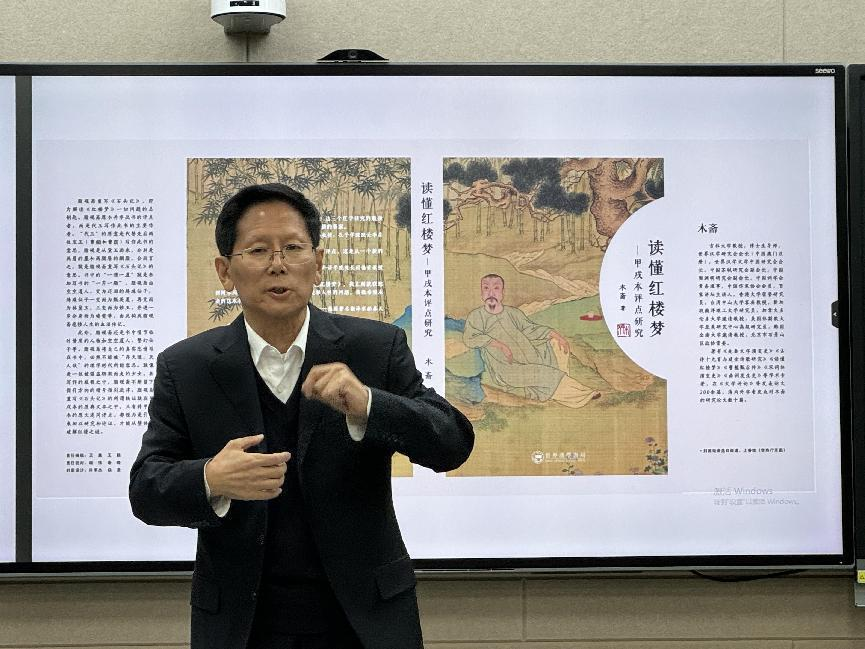3月24日,扬州大学特聘教授、博士生导师、香港大学荣誉研究员、世界汉学研究会会长、中国苏轼研究会副会长、中央电视台百家讲坛主讲人木斋教授应邀做客德赢官网Vwin文学院“一多中文讲座”第105讲,在明德三号楼智慧教室开展“读懂红楼梦——胭脂斋重写石头记”专题讲座。讲座由文学院副院长杨吉华教授主持,邱美琼教授担任对讲嘉宾,学院相关专业研究生到场聆听。