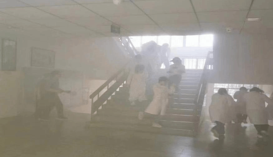 第二阶段,保卫处在参加应急演练学院的楼宇拉响火灾警报,同时点燃发烟罐,模拟火灾发生,各学院组织实验人员从实验室进行疏散逃生演练,按照疏散路线在指定时间内快速、安全、有序从最近的疏散通道撤离到安全地带。