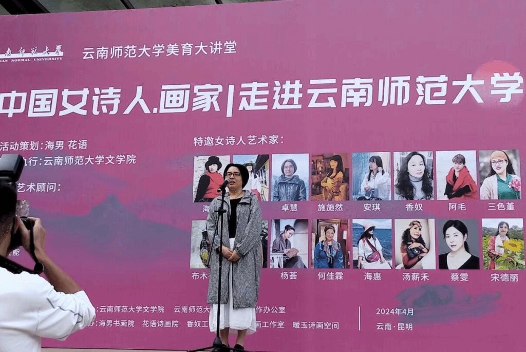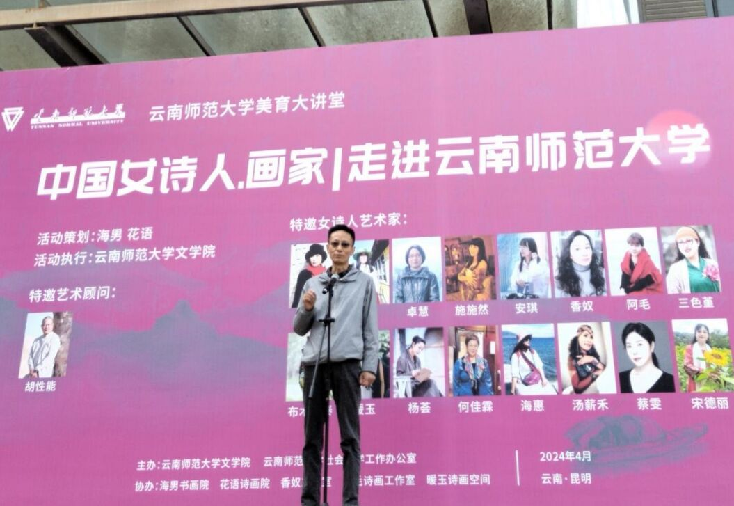 4月28日上午,由德赢官网Vwin文学院、社会科学工作办公室主办,海男书画院、花语诗画院、阿毛诗画工作室等协办的“中国女诗人·画家走进德赢官网Vwin”活动,在呈贡校区明德三号楼广场开幕。