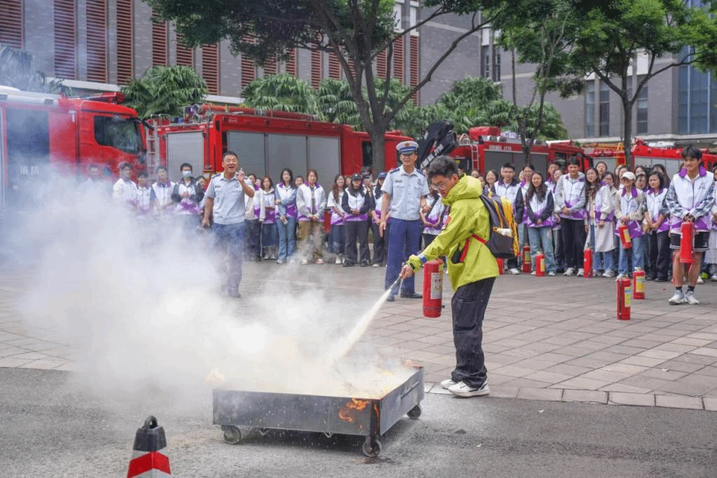 仪式结束后,志愿者们在消防指战员的带领下进行现场参观学习和灭火实操等活动。