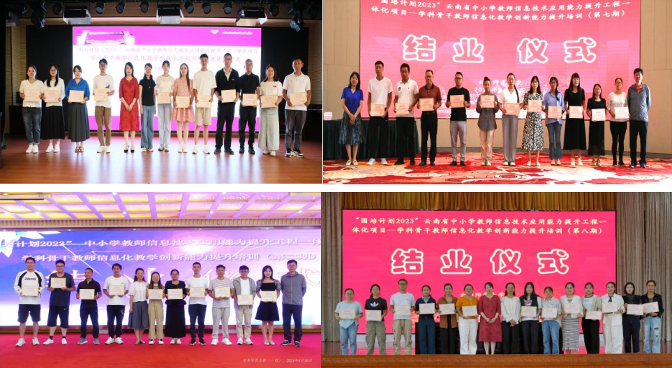 8月25日,项目第七期、第八期结业仪式在泸西举行。仪式上,各班优秀学员代表分享了培训期间的所学所思所悟,并就下一步如何将所学知识应用到教育教学工作中提出了自己的设想和计划,以期应对教育数字化转型的挑战,适应数字化时代的教育需求。继续教育学院院领导为优秀学员颁发了荣誉证书,希望学员们将所学所得带回课堂,鼓励大家在工作中继续努力,不断提升。