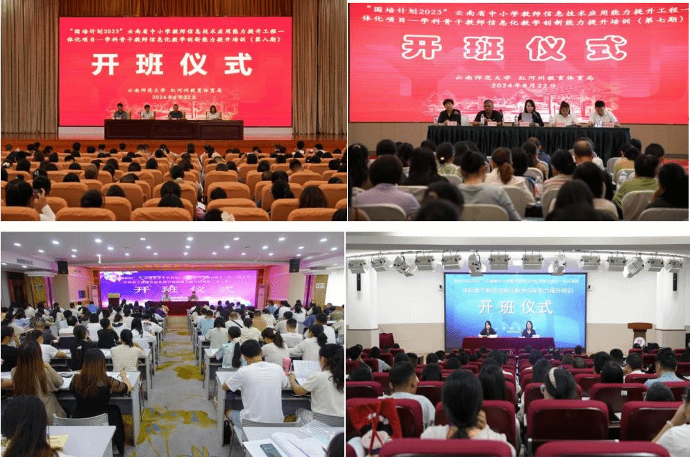 应红河州教育体育局的需求及省教育厅教师工作处的安排,项目第七期、第八期培训采取送教到县的方式实施。8月22日,分别在红河州泸西县委党校和金林国际酒店举行开班仪式。红河州教育体育局党组成员、副局长武冲林,泸西县人民政府教育督导室主任尚铁英,泸西县委教育工委副书记袁雁明,德赢官网Vwin继续教育学院院长张国华、副院长刘应兰及项目管理团队出席开班仪式。武冲林、张国华等作开班动员讲话,强调了提升教师数字素养赋能红河州基础教育高质量发展的重要意义。