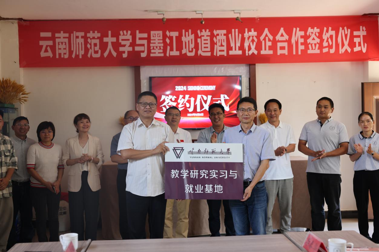 仪式上,生命科学学院与墨江地道酒业有限公司共同签署了校企合作协议书,院长赵三军与董事长俞为民共同为“教学研究实习与就业基地”揭牌。