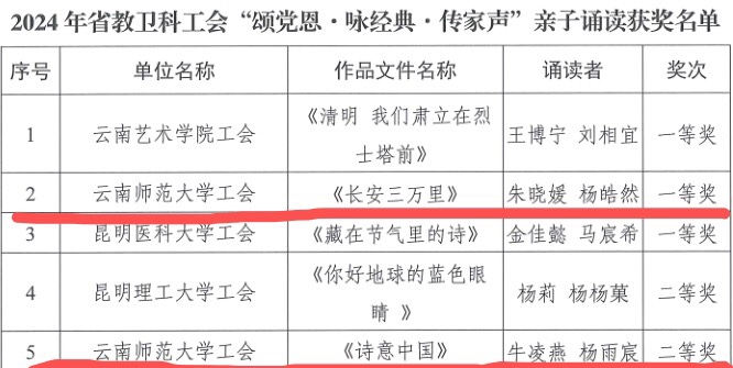 为全面贯彻落实党的二十大精神和习近平总书记关于注重家庭家教家风建设的重要指示精神,传承弘扬中华优秀传统文化,厚植爱国情怀,彰显中华语言与文化魅力,增强家庭文明建设,弘扬家庭美德,由校工会、校工会女职工委员会、校妇联选送参与云南省教育卫生科研工会“颂党恩·咏经典·传家声”亲子诵读活动作品《长安三万里》《诗意中国》分获一等奖、二等奖。