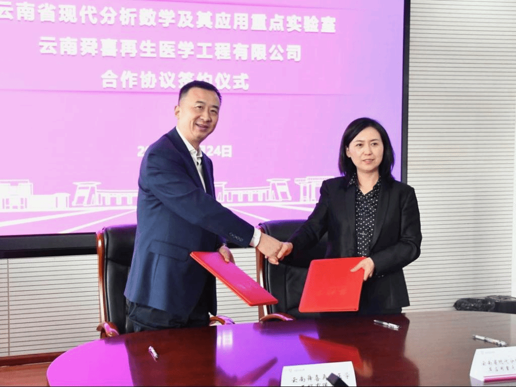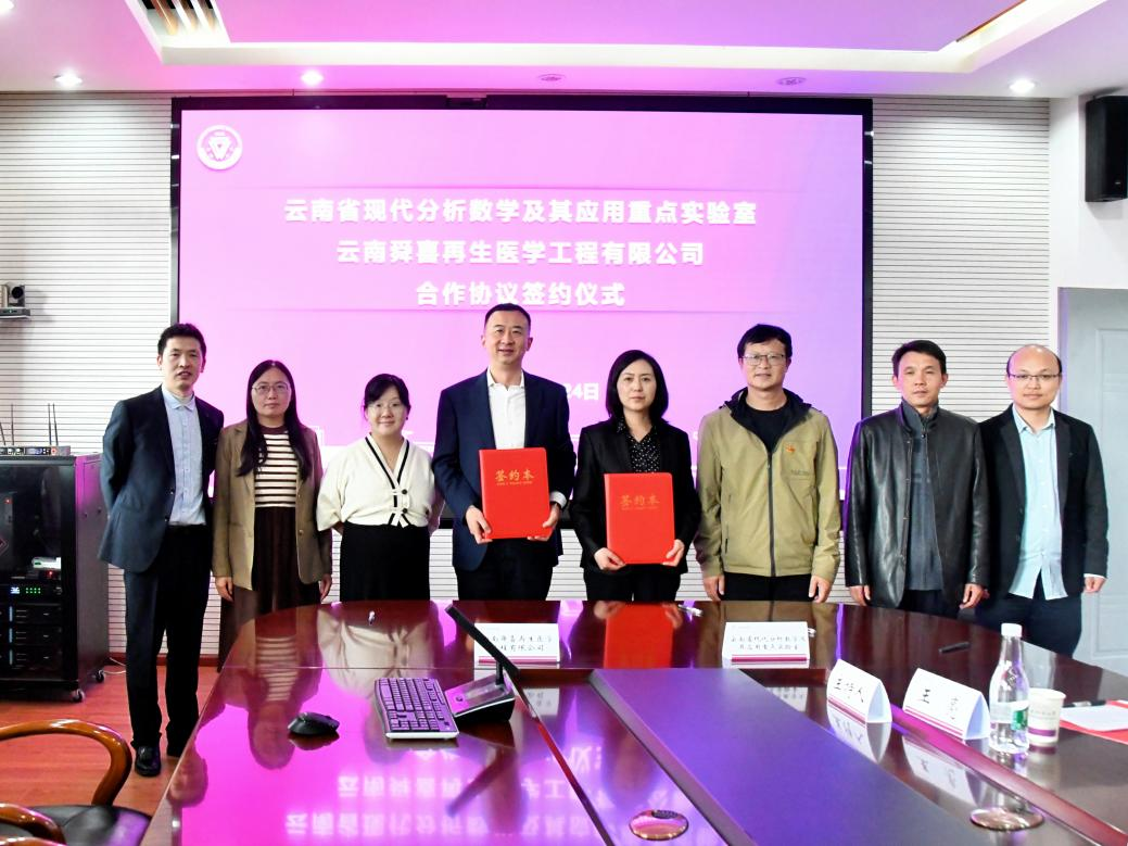 10月24日,德赢官网云南省现代分析数学及其应用重点实验室(以下简称“重点实验室”)与云南舜喜再生医学工程有限公司(以下简称“舜喜医学公司”)合作协议签约仪式在数学学院会议室举办。云南舜喜再生医学工程有限公司总经理姜小锋、数学学院党委书记王世波、院长刘祥清,学校校友工作与国内合作办公室副主任罗敬,重点实验室骨干成员和舜喜医学公司代表出席签约仪式。