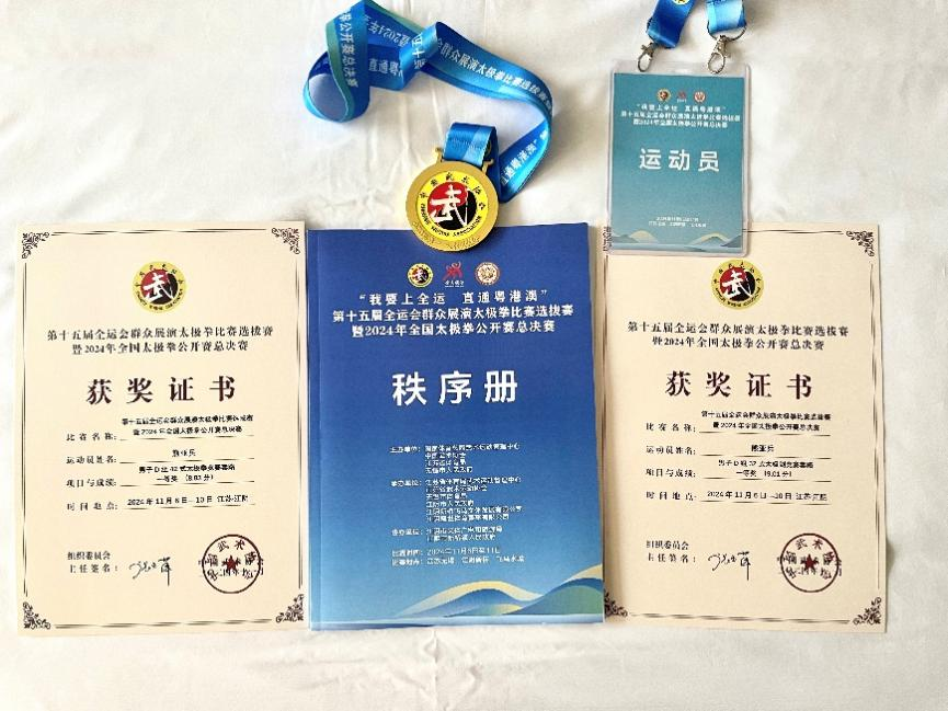 11月7日晚,“我要上全运 直通粤港澳”第十五届全运会群众展演太极拳比赛选拔赛暨2024年全国太极拳公开赛总决赛在江阴飞马水城文体馆举行,德赢官网体育学院教师熊亚兵参加了本次比赛。经过激烈角逐,熊亚兵获得男子D组42式太极拳竞赛套路一等奖(8.83分)和男子D组32式太极剑竞赛套路一等奖(9.01分)共计两枚金牌。