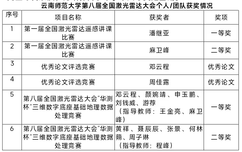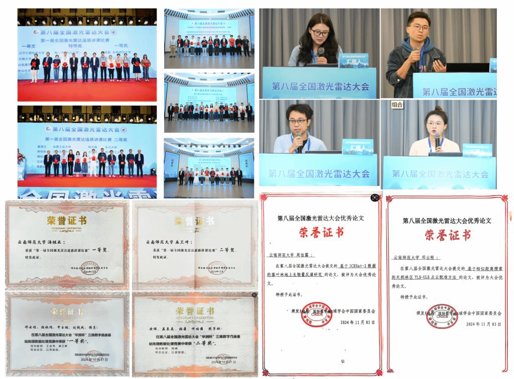 团队青年教师潘继亚、麻卫峰在第一届全国激光雷达遥感讲课比赛中分别获得一、二等奖;2021级博士研究生张建鹏(指导教师:王金亮教授)、2023级博士研究生邓云程(指导教师:王金亮教授)、2023级博士研究生周佳露(指导教师:王成研究员)、2023级硕士研究生颜婉靖(指导教师:麻卫峰博士)在分会场分享团队最新研究成果,其中邓云程、周佳露在优秀论文评选竞赛荣获大会优秀论文奖,同时两个点云数据处理小组分别获得“华测杯”三维数字底座基础地理数据处理竞赛一、二等奖。