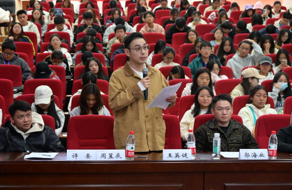 王英健对比赛进行点评,他分析了参赛队伍的优点与不足,并鼓励同学们要善于运用辩证思维,加强语言组织和论证辩驳等能力。