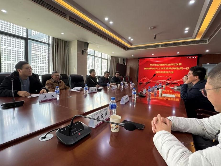 11月26日,滇西科技师范学院新能源与动力工程学院副院长(主持工作)谭丹英、杨丕华副教授、西南大学银龄教师陈建教授、能源与动力工程专业负责人傅永平教授、能源与动力工程专业兰江老师一行到德赢官网能源与环境科学学院访问交流。德赢官网能源与环境科学学院院长陈玉保、党委副书记蒋金和、副院长马逊以及相关教师参加座谈交流。