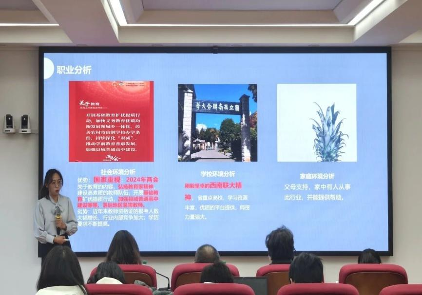 为增强学生生涯规划意识,提高学院生涯规划与就业指导水平,促进毕业生尽早高质量充分就业,12月13日,职业技术教育学院在一二·一西南联大校区举办职业规划大赛院级决赛。学院党委书记李红,院长牛元帅,副书记向斯楠,副院长李朝有、姜元涛、桑彬彬,专业负责人余媛媛,辅导员祁静、钟英实验学校副校长葛成,中志教育副校长张鹏担任评委。