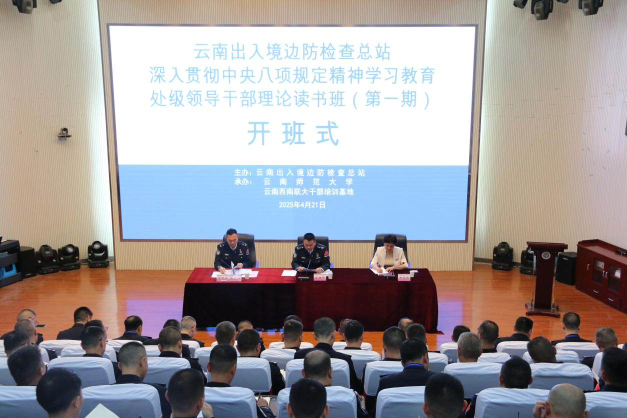 4月21日上午,由云南边检总站主办,云南西南联大干部培训基地承办的“深入贯彻中央八项规定精神学习教育处级领导干部理论读书班(第一期)”在德赢官网呈贡校区开班。云南边检总站党委副书记、政委吴勇军,德赢官网党委副书记和雪莲参加开班仪式。全省各边防检查部门处级干部79人参加培训。开班仪式由云南边检总站党委委员、政治处主任朱传亮主持。