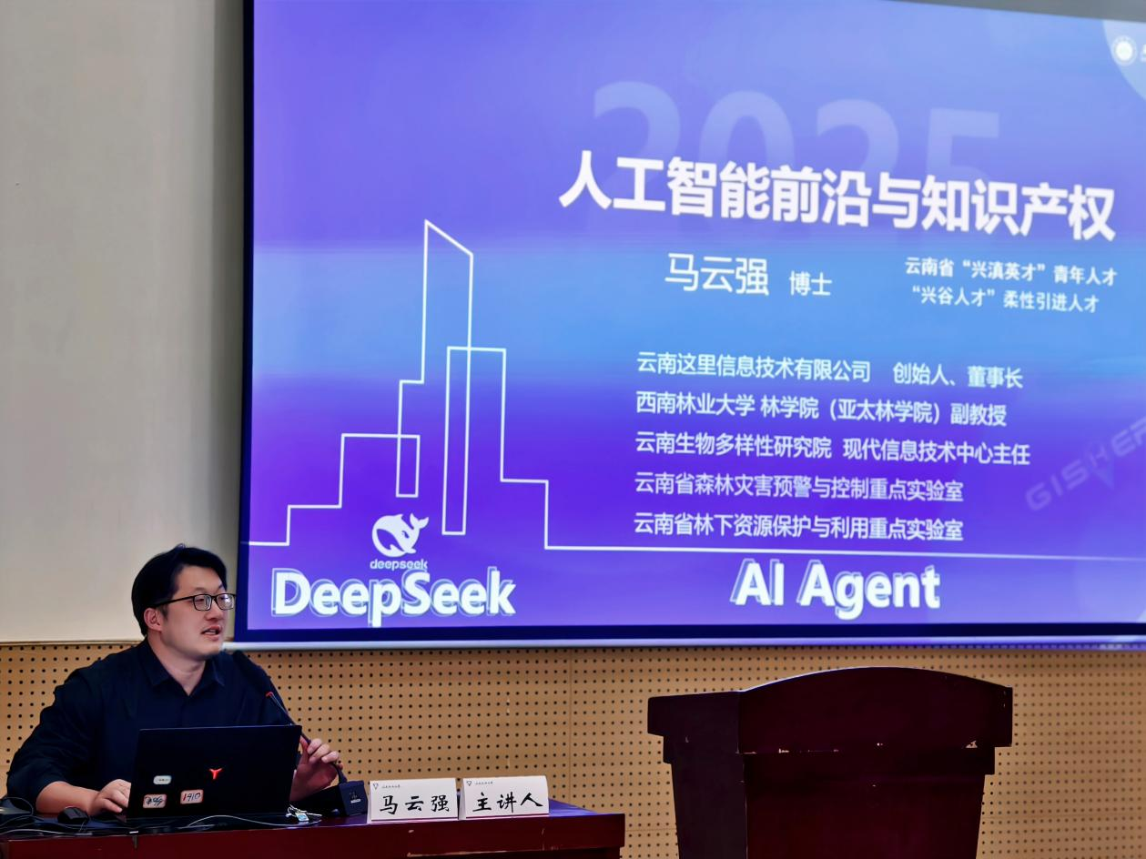 本次宣讲会邀请云南这里信息技术有限公司负责人、知识产权专家马云强作主题报告。他以《人工智能前沿与知识产权》为题,结合全球AI技术发展趋势,结合国内外典型案例,剖析了人工智能领域背景下涉及知识产权的相关问题。他表示,以AI与物理电子深度融合为契机,目前需构建数据权益界定、算法专利保护与成果快速转化的立体化机制,让创新动能充分激活、产业价值精准释放。