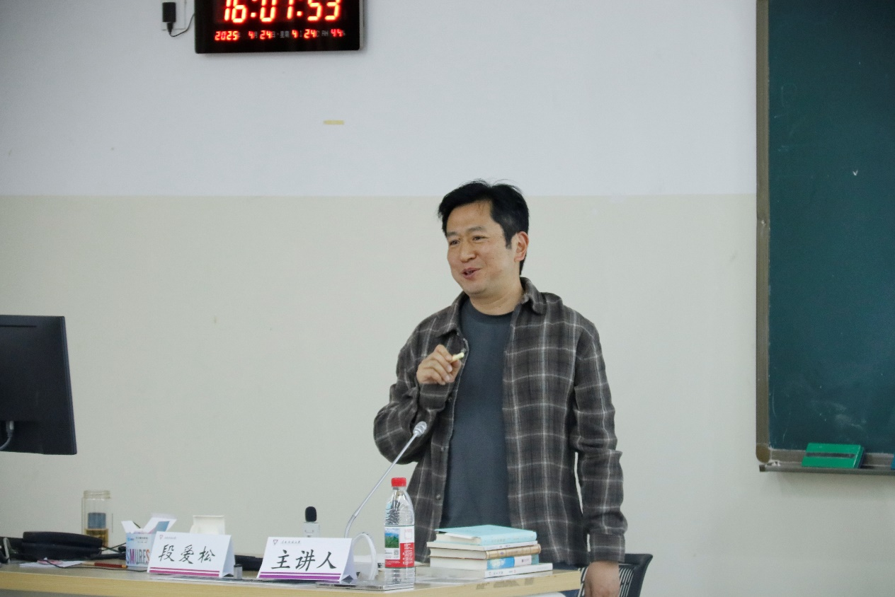段爱松与同学们分享了自己的创作经历,他认为文学创作的核心并非寻求标准答案,而是在多元视角中展现作者的思辨能力。讲座中,段老师引经据典,引用美国诗人华莱士·史蒂文斯的《观看一只黑鸟的十三种方式》,阐释了爵士乐即兴节奏与诗歌意象跳跃的内在呼应关系;用泰戈尔《飞鸟集》中“生如夏花之绚烂”的哲思,讲述了传统文化思想与现代诗学的融合之美;用《红楼梦》解读文学创作的核心要素。他认为,传统文化可以解构为“显性”与“隐性”双重维度,显性文化如唐诗宋词、非遗技艺是可见的文化载体,隐性文化如美德伦理、民族气质、人文思想则是内化的精神内涵。他鼓励文学院学子,要敢于尝试,将中华优秀传统文化融入文学创作之中,用文学的方式传承与发展中华优秀传统文化。