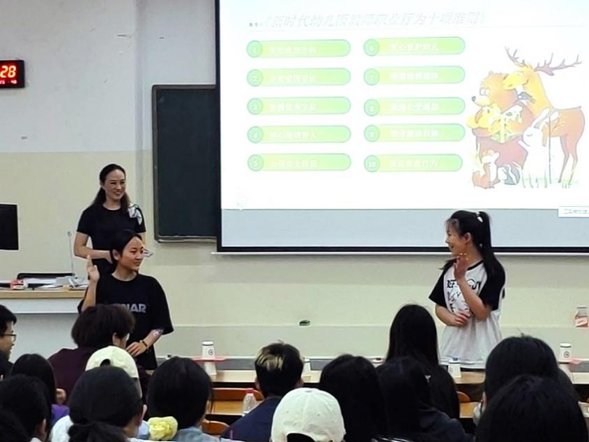 以“从心出发 以爱滋养——卓越幼师的成长密码”为主题,毕云艳为同学们讲解了“报国、育人、弘道”的教育家精神核心要义。结合一线工作经验,她结合案例系统介绍了幼儿园教师的职业素养,设置了手指游戏等互动环节,为现场添加了更多趣味性。