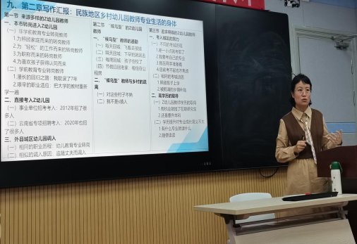 主题二“民族地区乡村幼儿园教师专业生活研究”,博士生殷思华基于扎实的田野调查,汇报了乡村幼师专业生活的图景、本质、影响因素、提升建议等内容。与谈人与点评专家认为该研究为民族地区学前教育教师研究提供了重要参考,从数据分析处理、研究思路、章节框架、理论选取和升华等角度提出改进建议。
