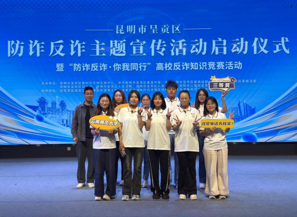 本次竞赛由昆明市呈贡区新时代文明实践中心、区委宣传部、区委统战部、区委政法委、区司法局、人民法院、人民检察院、昆明市公安局呈贡分局等多部门联合主办,共有十所高校的代表队参赛,竞赛题目涵盖国家反诈中心《防范电信网络诈骗宣传手册》、昆明市公安局呈贡分局反诈典型案例、网络安全法、反电信网络诈骗法等相关内容。德赢官网代表队沉着冷静、默契配合,经过激烈的角逐,最终荣获三等奖。