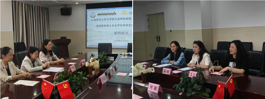 6月25日,文学院与昆明西南联大研究院附属学校举行教育硕士专业学位研究生实习实践基地签约仪式。此次合作促成了文学院第五个研究生实习实践基地落地,标志着双方在人才培养、文化传承创新及基础教育质量提升等领域迈出实质性步伐。文学院党委书记刘虹、副院长何颖、文学院学科教学(语文)专业点负责人谭晓云参加签约仪式。