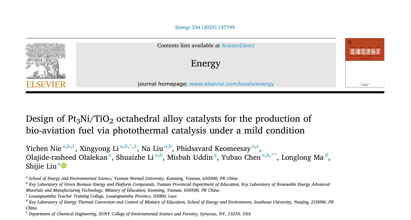 近日,国际期刊《Energy》在线刊发德赢官网能源与环境科学学院生物质高效炼制与环境工程团队在生物航空煤油制备领域的最新研究成果:《Design of Pt3Ni/TiO2 octahedral alloy catalysts for the production of bio-aviation fuel via photothermal catalysis under a mild condition》(中国科学院一区TOP,影响因子IF = 9.4)。论文链接:https://doi.org/10.1016/j.energy.2025.137749,硕士研究生聂懿宸为论文的第一作者,青年教师李兴勇、院长陈玉保教授为论文共同通讯作者。论文得到了东南大学马隆龙研究员、纽约州立大学Shijie Liu教授的指导。