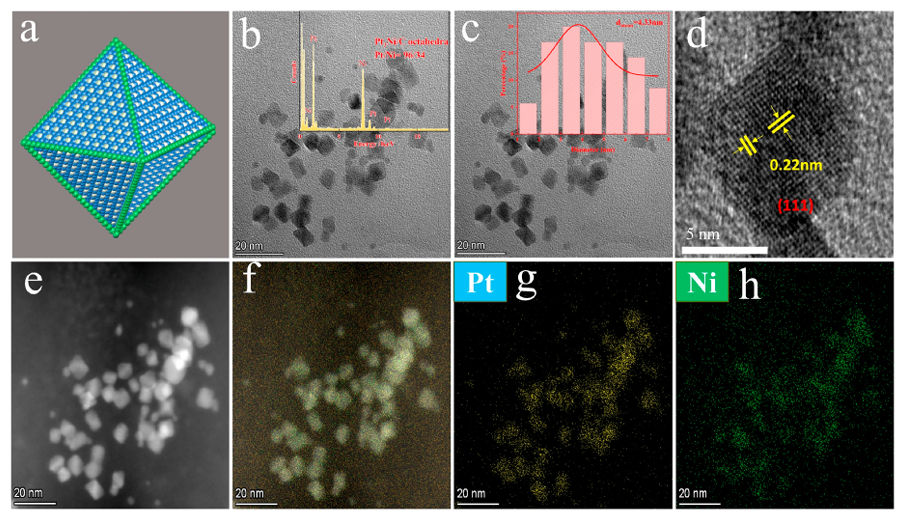 研究团队通过一步水热法合成了Pt₃Ni/TiO₂八面体合金催化剂,其独特的八面体结构暴露出更多 (111) 活性晶面,透射电镜 (TEM) 证实了Pt3Ni合金的存在,且形貌为独特的正八面体结构。实验结果表明,该催化剂催化效率高,其催化底物范围较广,目标产物C₈-C₁₇烷烃选择性达79.1%。与传统工艺相比,大大节约能耗。同时,将昂贵的Pt与非贵金属相结合,有效降低了贵金属的用量,进一步降低了实验成本。此外,理论计算进一步说明,氧空位优先于合金吸附模型分子,同时能够吸附活化氢,合金相对于单一金属具有更强的吸附模型分子能力。
