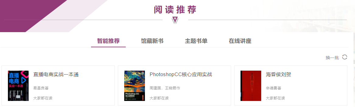 “阅读推荐”板块根据个人借阅记录、浏览记录分析个人阅读喜好,为读者智能推荐个性化书籍。“馆藏新书”模块定期进行新书信息更新,推荐优质到馆新书。