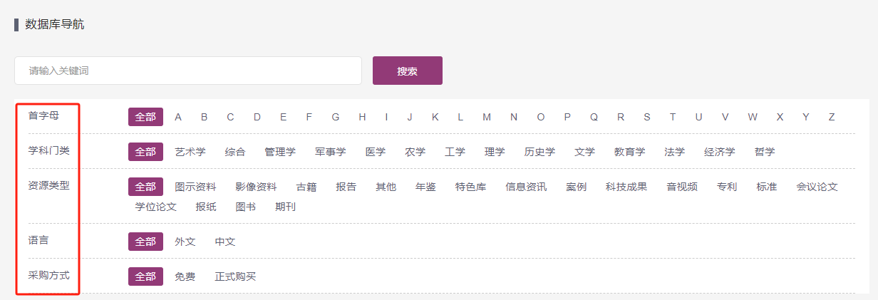 展示购买、试用以及部分免费数据库列表,支持按文献类型、学科等属性进行浏览。可在“详情”页面了解各数据库使用说明。