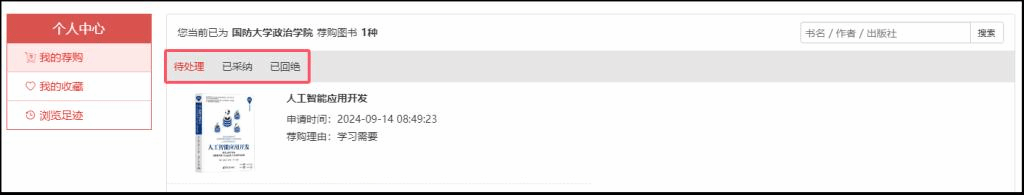 4. 我的荐购:【个人中心】→【我的荐购】 中可查看到所有的荐购书目及图书馆的采纳情况。